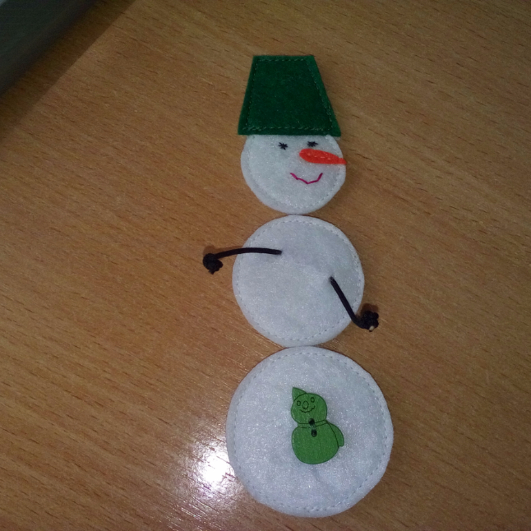 11. Прострочила тесемки с флажками. К основе странички пришила мягкую часть липучки, собрала снеговика. На каждом шарике появилась пуговка того же цвета.