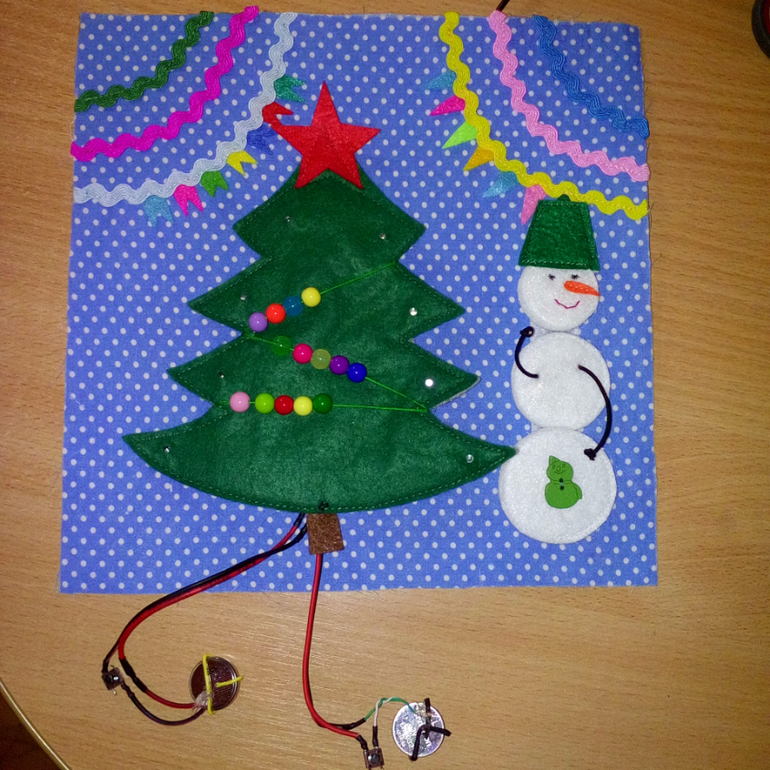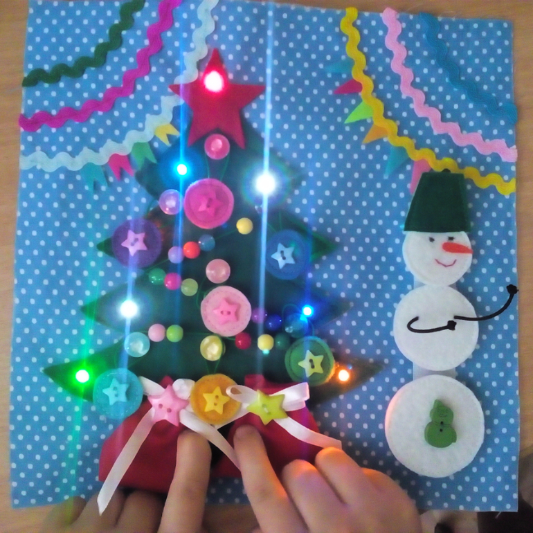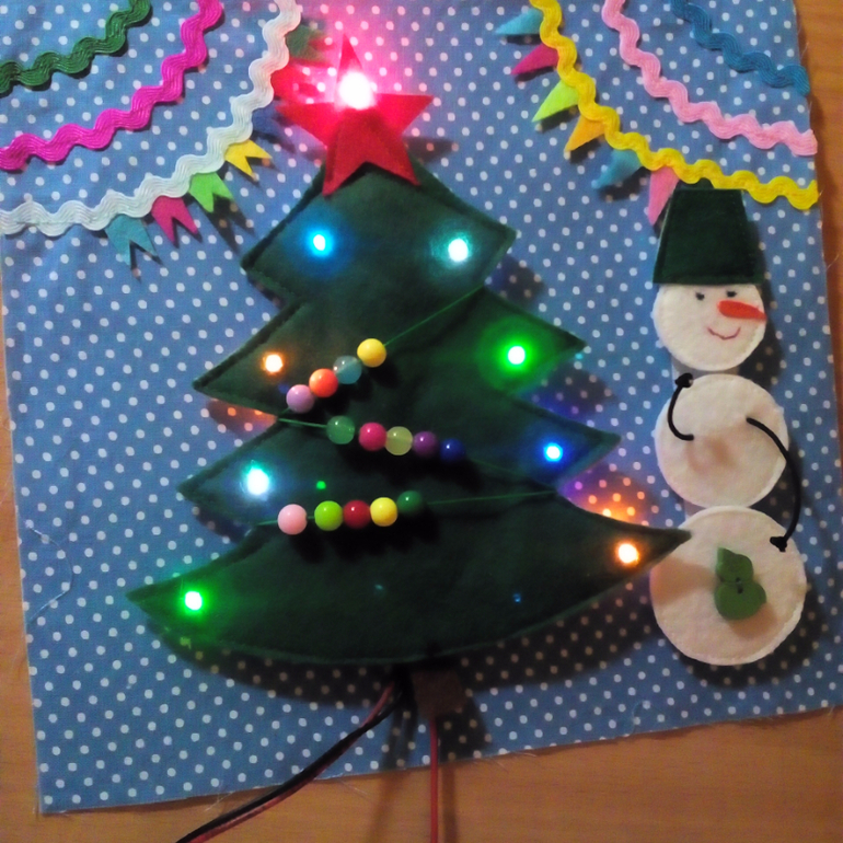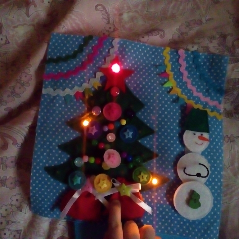 Страничка самая сложная по исполнению, так как здесь, кроме швейной части имеется еще и электротехническая. Супруг по своей инициативе принял участие, установил лампочки, проложил провода, и теперь ёлочка у нас по-настоящему зажигается, мигает и горит разноцветными огнями.