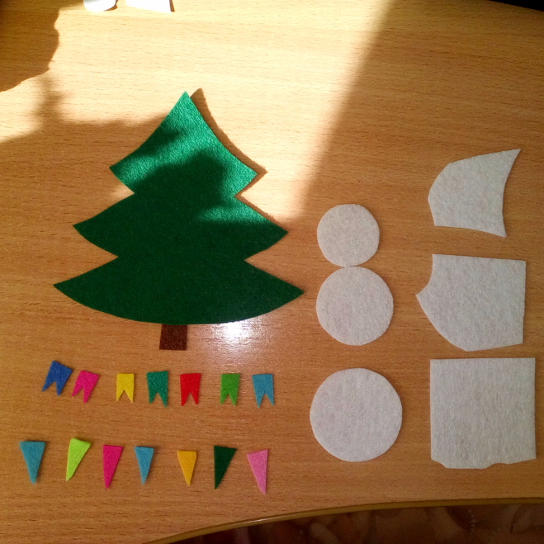 2. Вырезала детальки елочки, снеговика и украшений из фетра.![]()