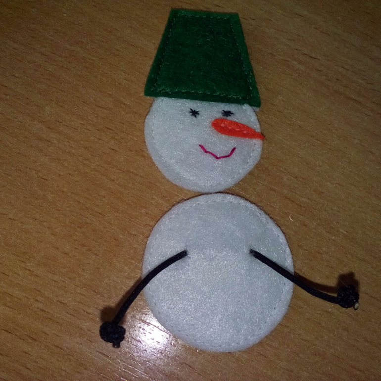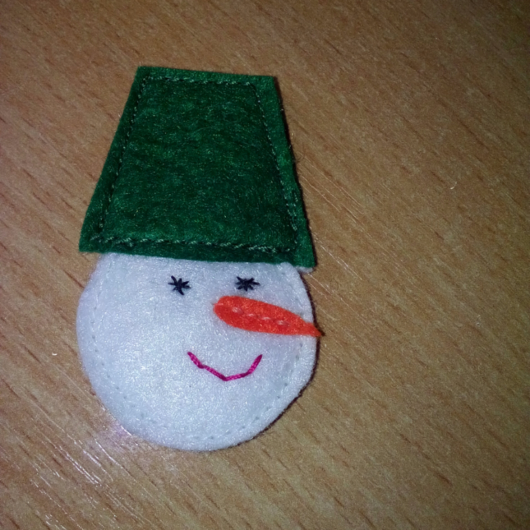 7. К верхней части снеговика пришила головной убор, нос и вышила глазки и ротик.