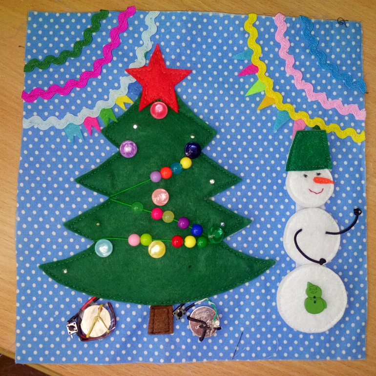 Страничка называется «Новый год», её основная развивающая и обучающая составляющие таковы: мелкая моторика (украсить елочку шарами, прикрепить/открепить фигуру снеговика на липучке, включить гирлянду, передвигать бусины на елочке, ручки-перетяжка у снеговика), сенсорика (фактуры и цвета, гирлянда), познавательный аспект (понятия "верх-низ", "право-лево", "светло-темно", счёт, рассказ о празднике Нового года).