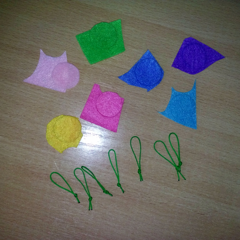Материалы: фетр красного, белого, зеленого и оранжевого, светло- и темно-розового, фиолетового, синего и голубого цветов, пуговки, тесьма-змейка разных цветов, резинка и тонкий шнур, бусины, красный габардин, белая атласная ленточка, велкролента, хлопок и флизелин для основы. А также для технической части потребуются маленькие светодиоды, провода, батарейки и кнопочный выключатель.
