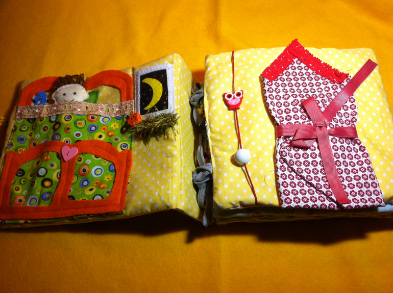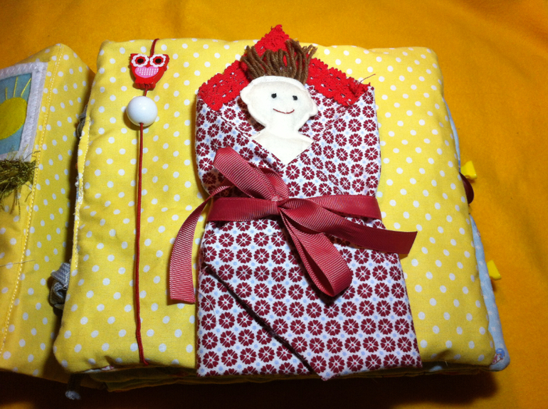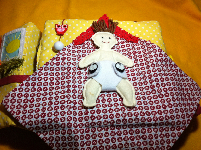 Первый разворот: кроватка. Ляля спит с мишкой-пуговкой, рядом окошко-карман, меняем день-ночь. На подоконнике травка и цветочек. Конверт - надеваем Ляле памперс на липучках и учимся завязывать на бантик. Для декора рядом на веревочке совушка и бусина.