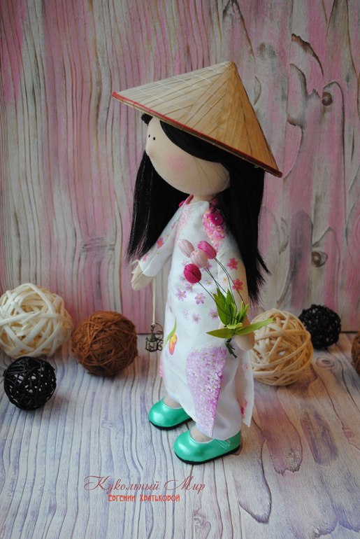 Кукольный мир - человекоподобные куклыПо свежим впечатлениям от отпуска была сшита новая девочка Вьетнамочка. Одета в традиционный женский вьетнамский костюм и соломенную шляпу. На ножках сандалики. Рост 37 см. Под катом 4 фото