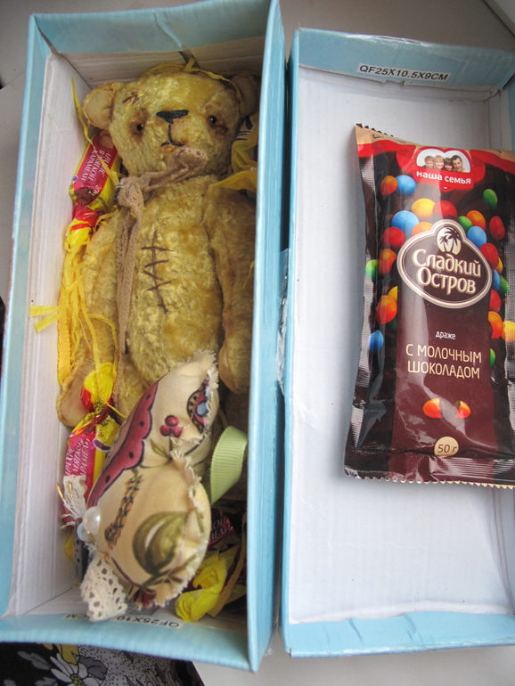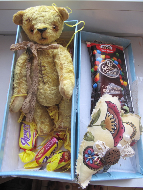 Приехал он не один, а привез с собой замечательное сердечко и вкусные конфетки. А еще он лежал на желтенькой красивой подстилочке, так что доехал с комфортом.