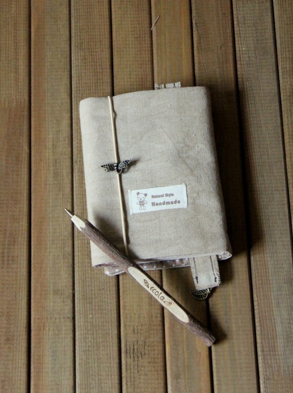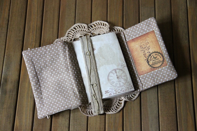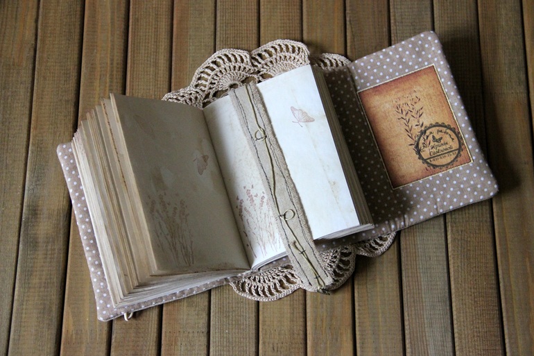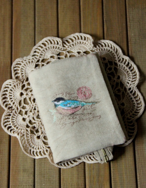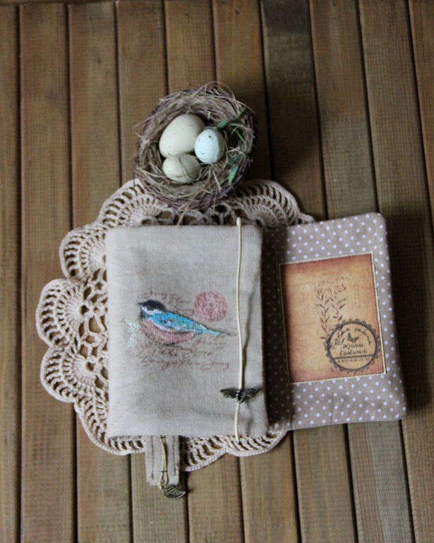 Вот он, красавец из льна, тонированные странички, по-разному проштампованы - травы, птички, стрекозы.