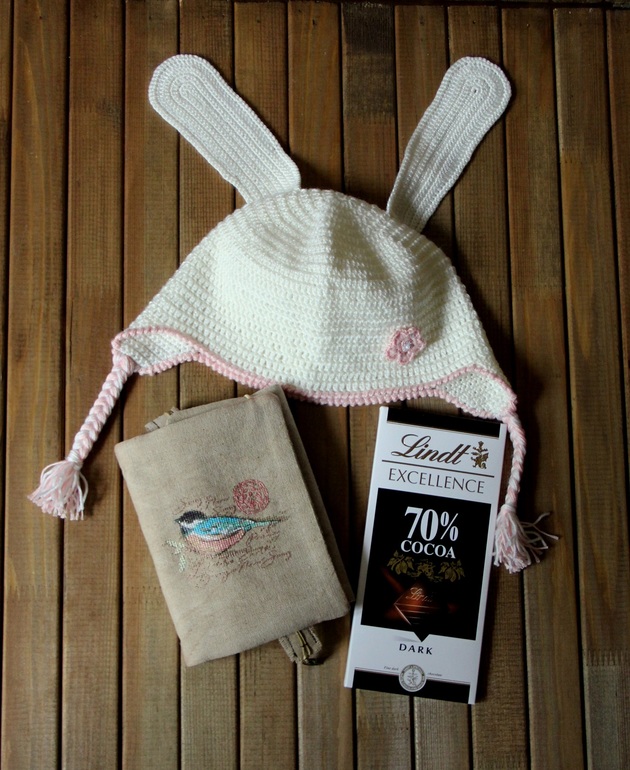 Сюрприз к обмену для моей малышки - шапка-зайка. Милейшая получилась вещь, с размером все тоже замечательно.