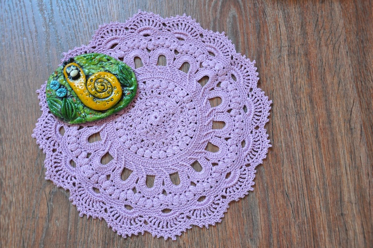Лена связала шапули моим куклам и давно желанную мною салфеточку, а еще прислала подарочки. Чудный магнитик из теста и салфеточка поближе