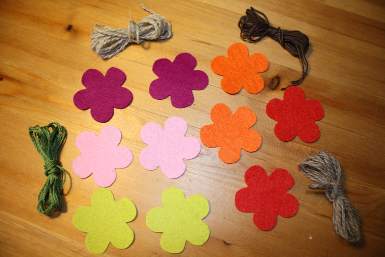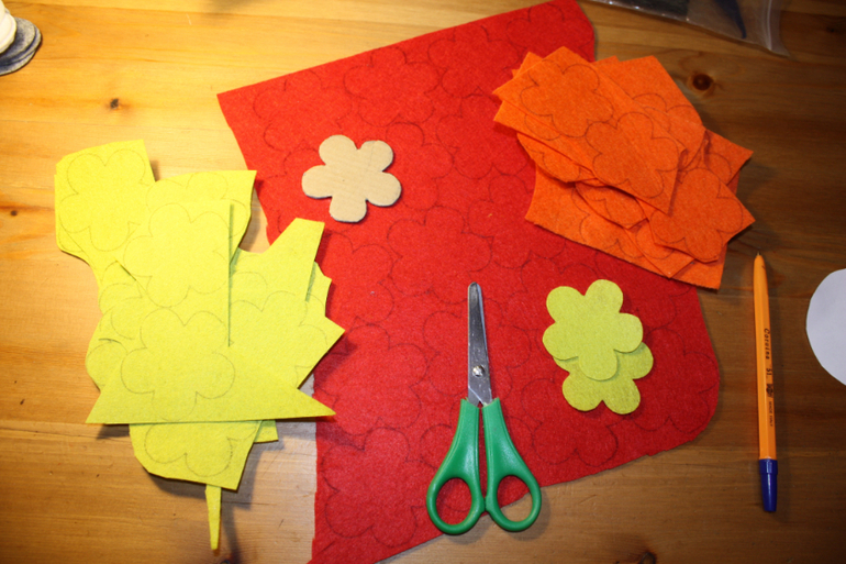 Он включает в себя 5 цветочков из китайского фетра (у меня на деревце было 4, а тут захотелось сделать 5). Там нужно посерединке сделать прорезь для продевания на пуговку. Обшить эти 2 части цветочка и по желанию какой-то декор. Ниточки для обшивки самого дерева и для обшивки 2-х гнездышек.