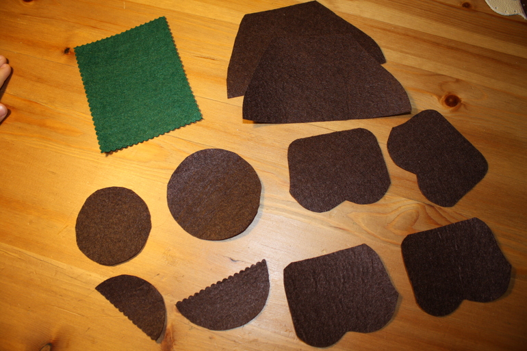 Зеленый китайский фетр для листиков. Каждый сам сможет выбрать какой формы листочки будут. У меня были крошечные, но может кто захочется др. формы. Потом внутренняя подкладка для дупла тоже из фетра (на дверцу и сам ствол) и формы для кармашков (2 на кроне и 1 в самом стволе у основания)
