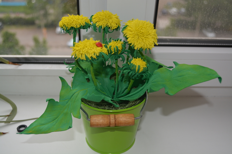 И еще классная композиция из одуванчиков в ведерке сделанная великолепными Мариниными ручками. Поставила в комнате на полочку и муж когда увидел сказал - зачем ты их выкопала они же быстро завянут. Они такие реалистичные!!!!