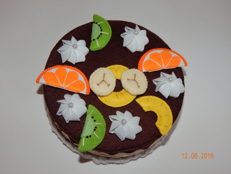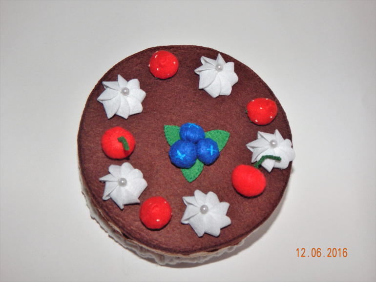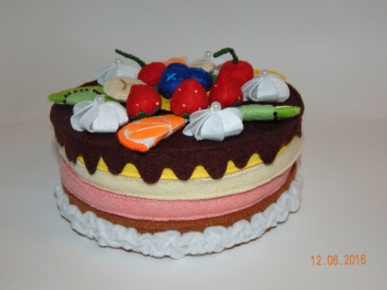 Развивающие игрушкиРазвивающий торт-конструктор из фетра диаметр 16 см. Прекрасно подойдет для сюжетно-ролевых игр: в кафе, магазин. Возможно собирать разные варианты торта, как так в состав входит 4 коржа, шоколадная глазурь, различные фрукты и ягоды. Далее более 5 фотографий.