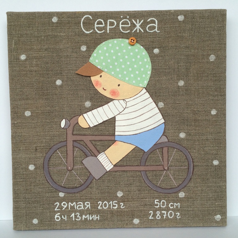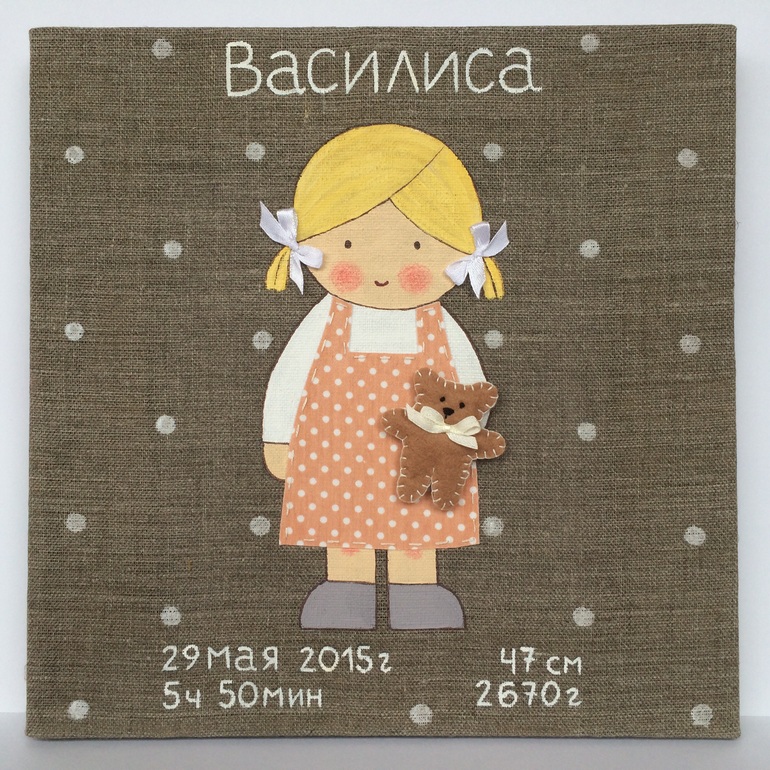 Холст 25х25 см, акриловые краски, об'емный декор- фетр, хлопок, пуговицы, атласная лента.