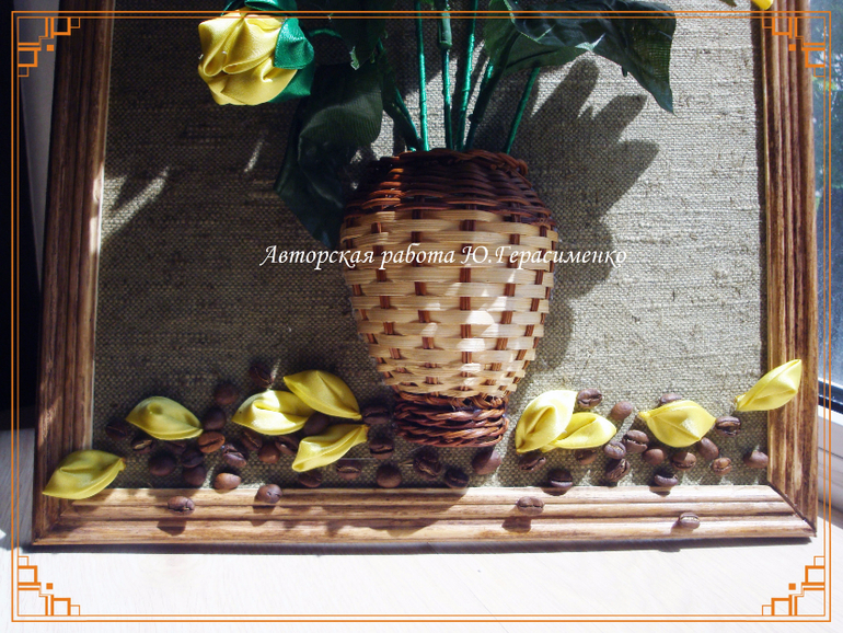 Использованные материалы: атласные ленты, кофе арабика, льняное полотно, проволока, дерево, фанера, картон, пенопласт.