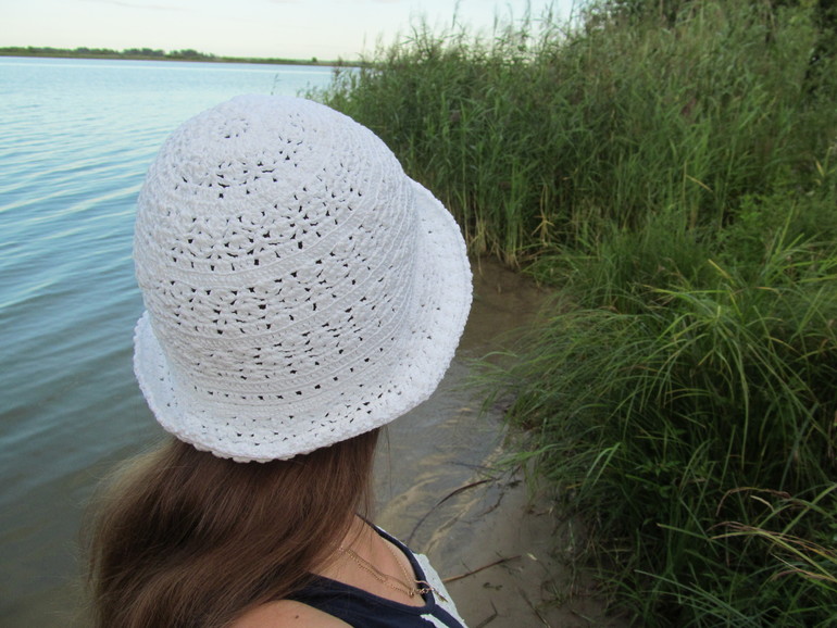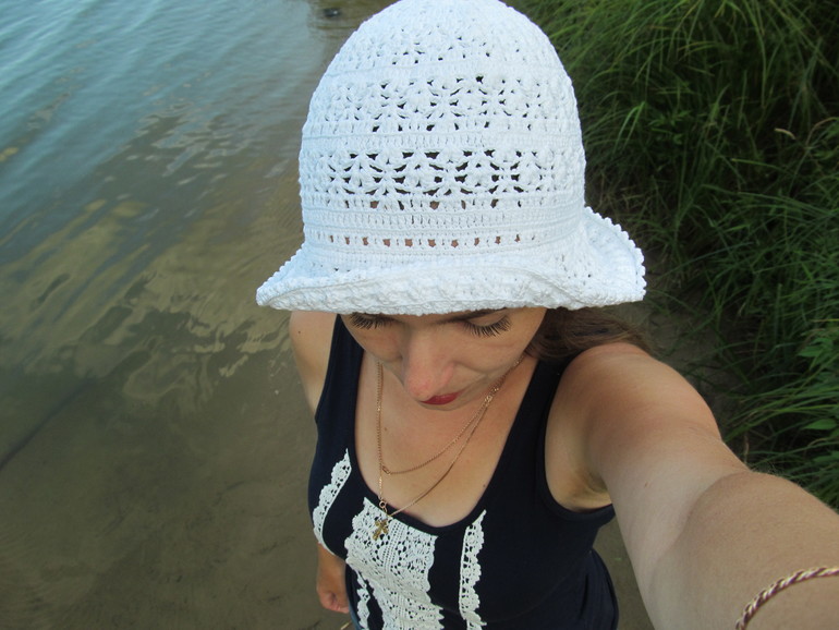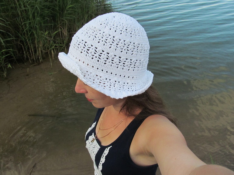 Схему я почти не меняла, только не довязала несколько рядов полей (мама не любит шляпы с широкими полями), а край обвязала одни рядом перекрещивающихся столбиков с двумя накидами, потом сразу ряд столбиков без накида с регилином внутри, и пико по самому краю. Ещё не раз буду вязать по этой схеме!
