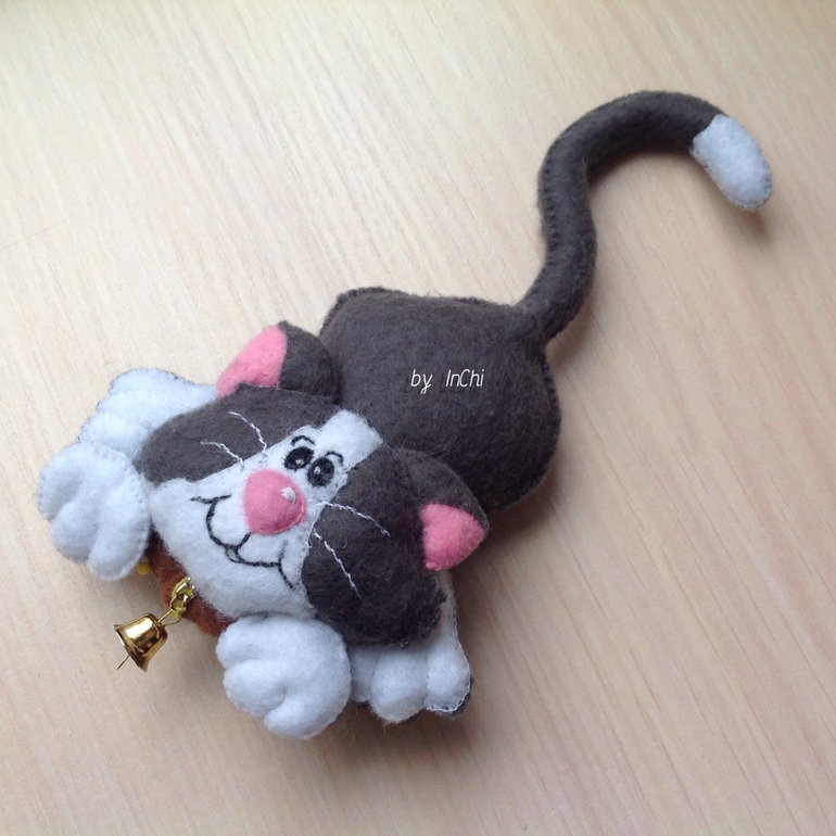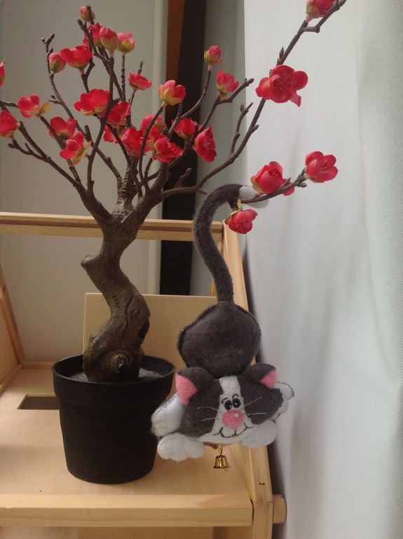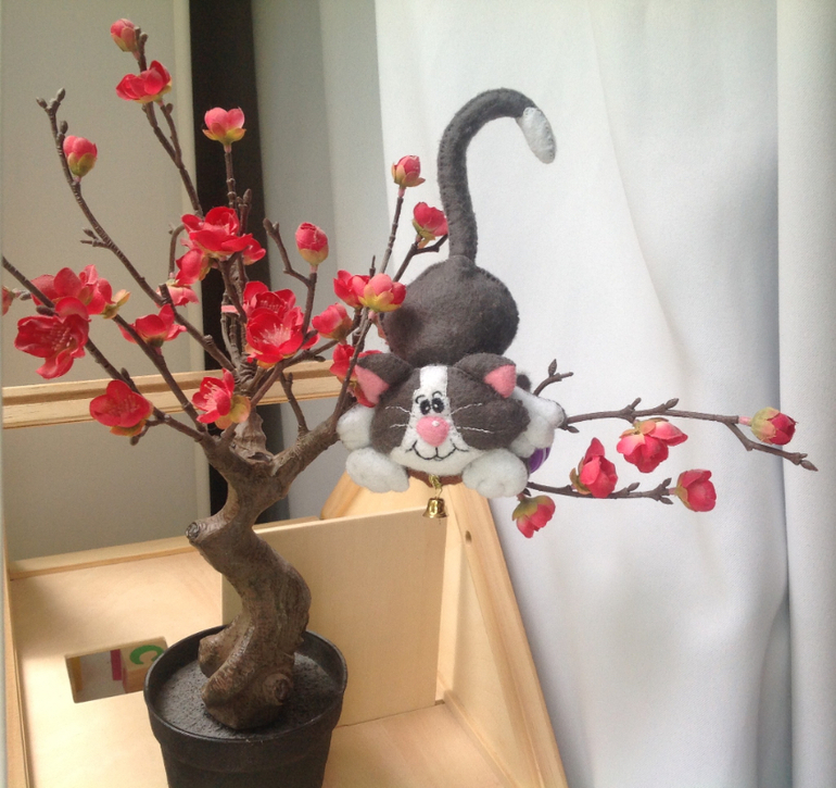 ФетрКотик. Внутри у него прищепка. Можно прицепить на монитор или посадить на декоративное дерево 😀. А еще повесить за хвост на ручку. Будет повышать настроение и в офисе!