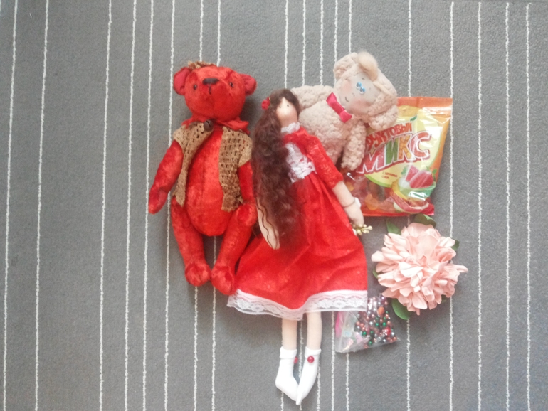 Обмены подарками, материалами для рукоделия (хвастики)Получила на днях посылочку от нашей феечки Юлии , ждала мишку и куколку тильдочку, а они приехали к нам не одни, а с компанией еще одной игрушки дочка из-за его меха назвала барашком ))) и подарочками !!!! Сладости, бусинки и пуговки для моего хомяка и восхитительной брошью