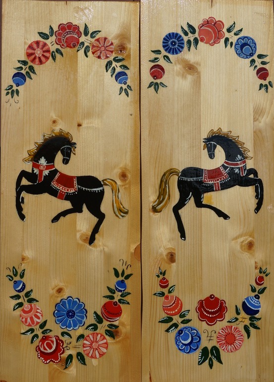 Грунтовать дерево я не захотела, красили гуашью, а она подтекает в неровности древесины, тут должна быть рука набита. Поэтому я обводила контуры у коней и цветов, дочка принимала участие в их закрашивании, украшении, листочки многие вообще сама рисовала. Кое-какие погрешности я потом подправляла.