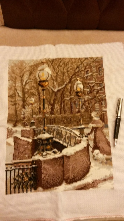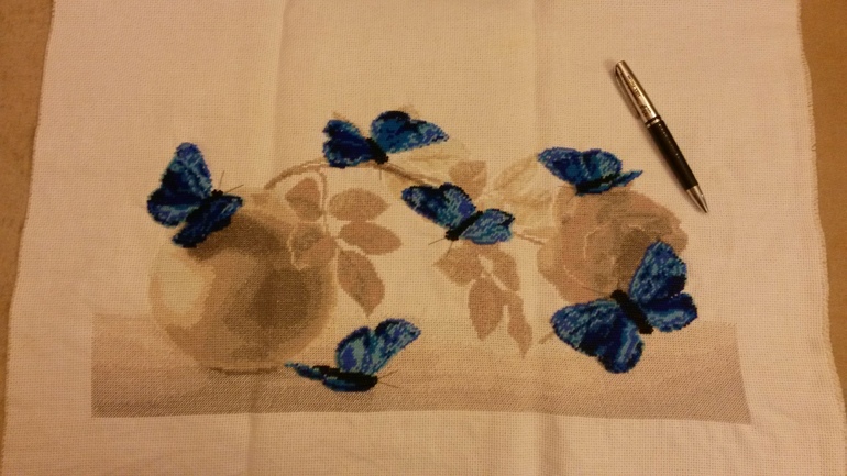 За качество фото извиняюсь, фотографировала на телефон и при искусственном свете. Ручка рядом с вышивкой для наглядности масштаба.