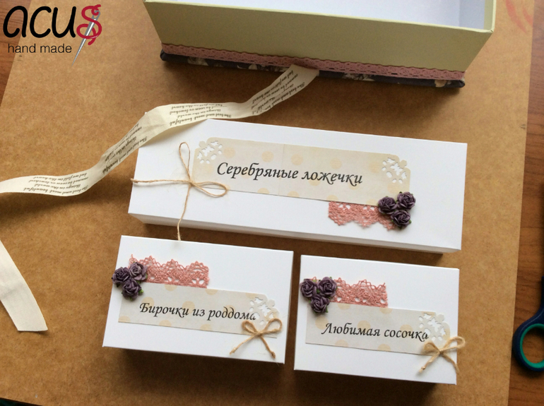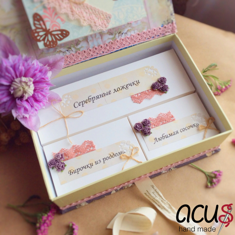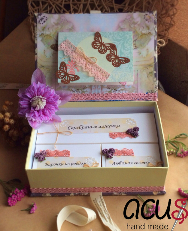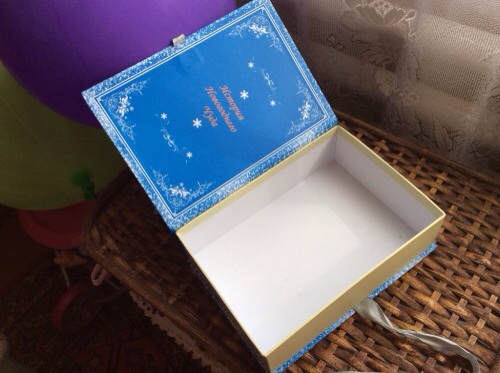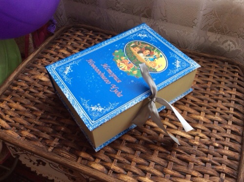 Вот такую коробочку с конфетками подарили доченьке на Новый год. Мне показалась она волшебной. Предлагала я ее девочкам, которые занимаются скрапом, но никого она не заинтересовала((( и тут я в одном сообществе увидела пост одной интересной бэбэшечки - Оли, которая писала что очень хочет шкатулочку для семейных сокровищ, тут и серебряные ложечки и бирочки нескольких поколений семьи и сосочка младшей доченьки. И вспомнив, об этой шкатулочке, предложила исполнить ее мечту.