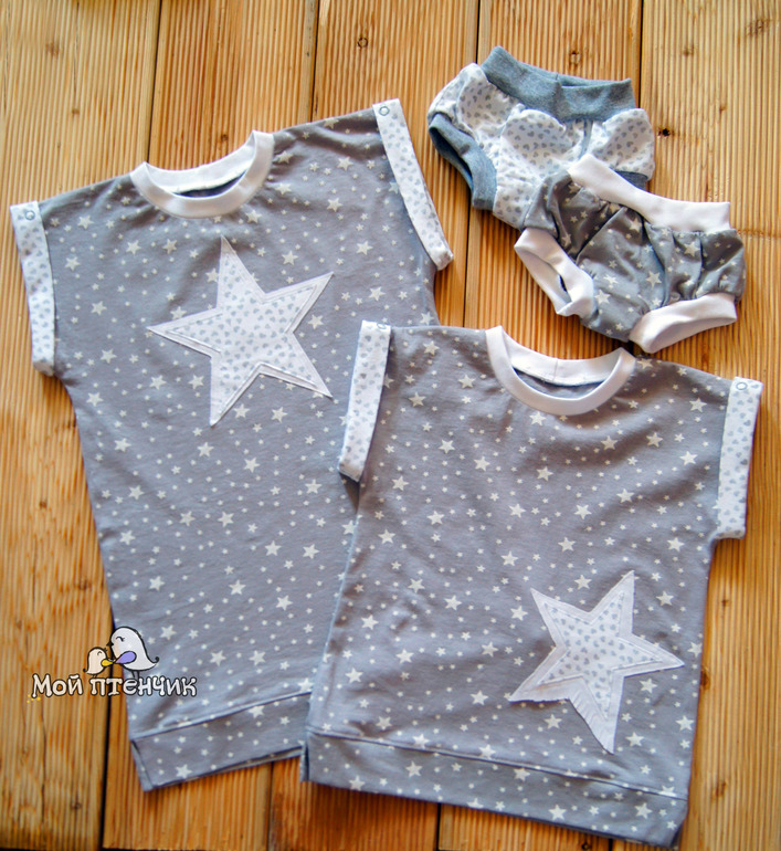 Здесь только два выкладываю, на деле есть ещё одно для дочи с брошкой и мне футболка, но их не отфотала до сих пор:( Ещё из этого метра ткани вышло три пары хипстеров, ни кусочка не осталось - как я люблю:)))