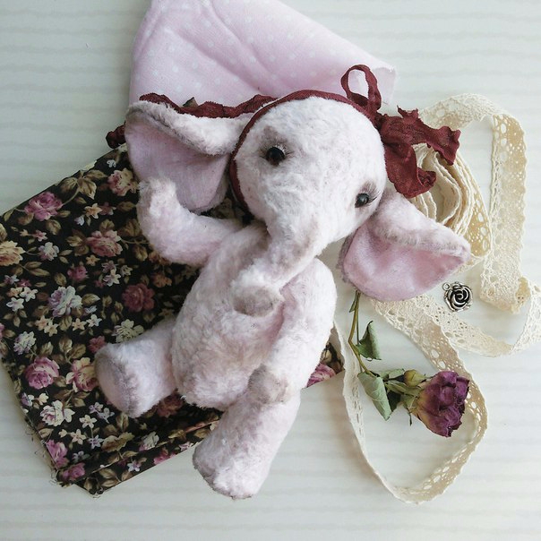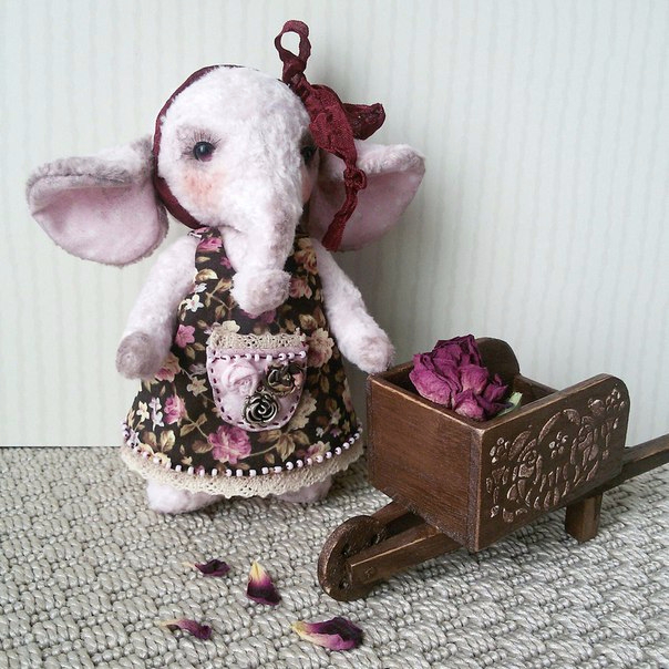 Слоняша сшита из нежного плюша ручного окраса (красит чудесная теддистка из Краснодара Надя Суворова) и хлопка, откормлена опилочками и металлическим гранулятом. Глаза стеклянные (Германия), с ресничками. Тонирована маслом. Платье с розами и хлопковым кружевом, на подкладке, снимается. На голове шебби-лента.