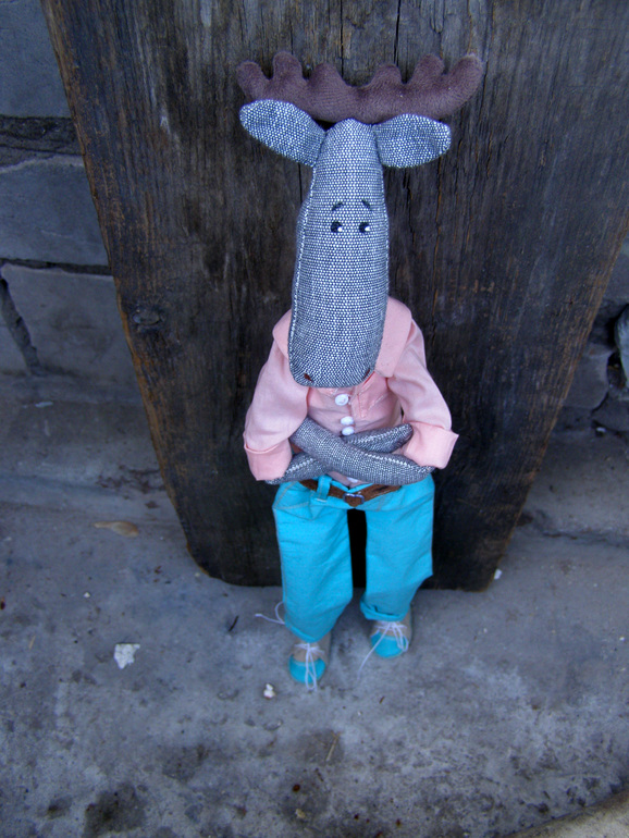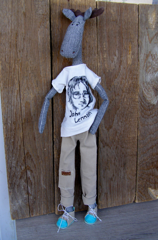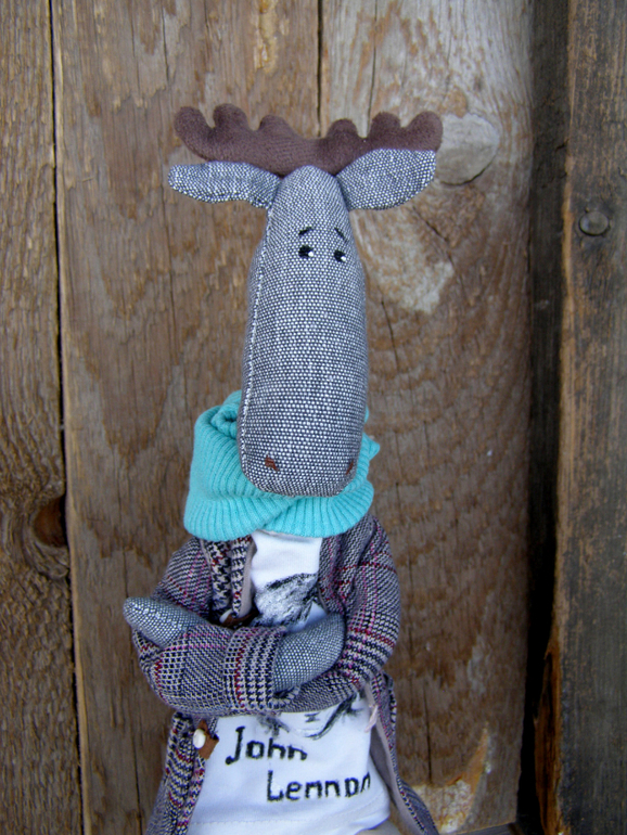 Игрушечный мир - животныеЛосик....Вы знаете...кто настоящий друг?....Тот...кто выслушает и поймёт..Лосик он такой и есть! Весёлый .. смелый и настоящий. Душа компании...но в минуты грусти...умеет поддержать даже молчанием. А ещё всегда вас будет ждать дома..на вашем любимом кресле, столе или подушке)). Но лучше берите его с собой...в путешествия..не пожалеете). А уж как любит хорошо одеваться)). Сшит лосик из хлопка со льном. Вся одежка съемная. Пиджак твидовый, пуговички из полимерной глины...есть бирюзовый модный шарф-снуд. А поскольку он меломан...то и хлопковая футболочка с принтом ручной росписи с любимым исполнителем Джоном Ленноном. И второй комплект: рубашечка и брюки. На копытцах вязанные ботики. Он мягкий и умеет круто складывать свои лапки)). Ростик 45см.
