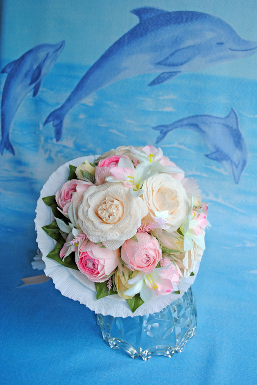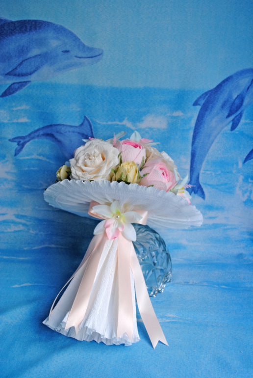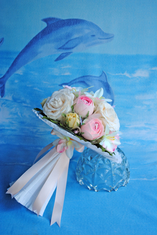 Жарко на улице, но творить всё равно хочется. Вот и сотворился свадебный букет в руку девочке. Очень нежный, в пастельных тонах, с искусственными орхидеями, розовыми пёрышками и маленькими перламутровым бабочками. Жаль, но фото не передаёт этих маленьких миленьких деталек.