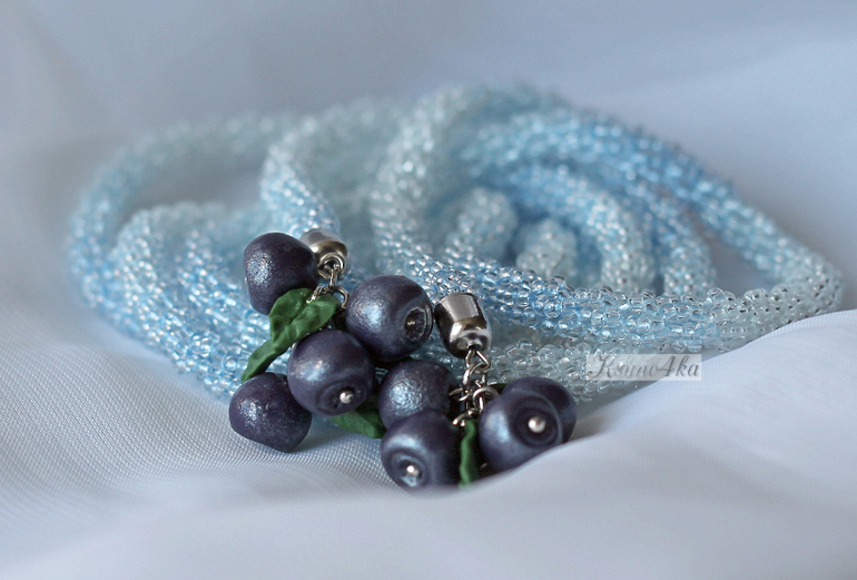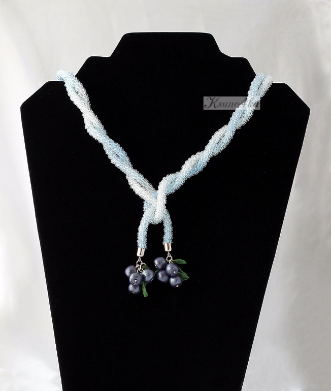 Работа выполнена из прозрачного чешского бисера, меланжевого Ириса от Виты и декоративных элементов из полимерной глины. Длина 120 см. + 3 см. подвеска.