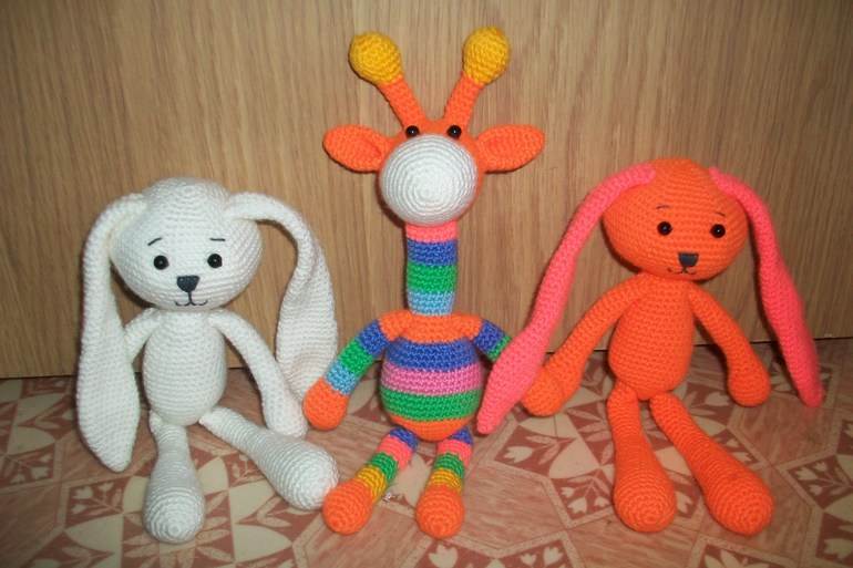 Ушастые зайки связаны по классической схеме (брала тут), ну и как всегда, жираф. Куда же без него!