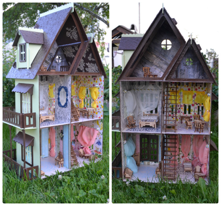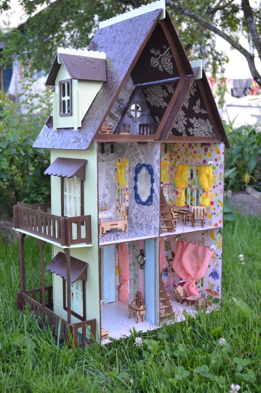 Домик выполнен из фанеры 5 мм толщиной, я заказала у знакомого он мне все сделал на станке и отдал. Я дальше начала работу. Все детали загрунтовала, отшлифовала. Затем собрала дом и решила с дизайном. Все подписала где что будет какого цвета, где какие обои, какие детали интерьера и т.д. Окрашен акриловыми красками. Крыша оформлена мятыми салфетками и покрашена. Внутри стены комнаты в технике декупаж (салфетки) , весь дом покрыт лаком на водной основе в несколько слоев. Шторки из вуали. Высота: 80 см Ширина: 50 см Глубина: 30 см Высота этажей: 25 см.