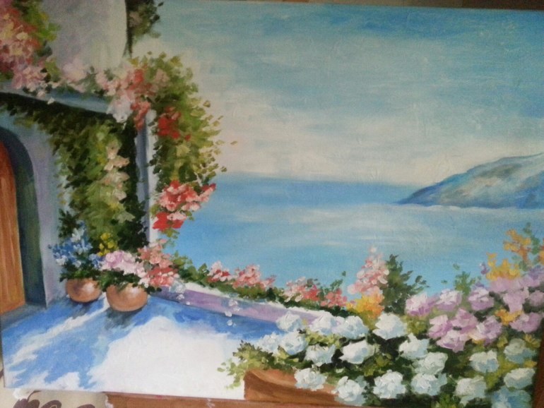 Дворик написан очень хорошо и живо, особенно нравится солнечный свет на полу, но по мне - просится само солнце на небо (я понимаю, что изображен примерно полдень и солнце высоко над головой, но его свет должен литься сверху, а не только падать на пол, не могу объяснить с устатку :) Поработайте с самим видом моря, может, сделать зеленее траву на острове справа, край острова песчаный, овечку туда с пастухом - вполне средиземноморский вид.