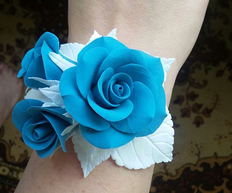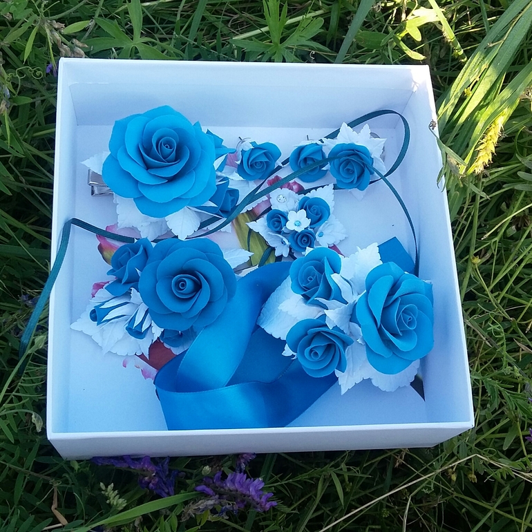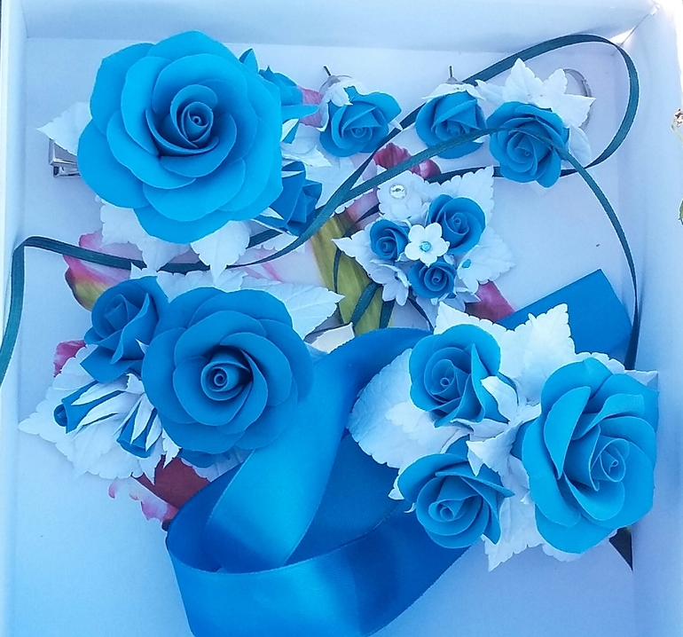 Скоро подруга идет на свадьбу и захотелось ее немного украсить. Свадьба в бело-бирюзовой гамме. Сделала браслет на руку на атласной ленте, заколку в волосы, кольцо и кулон. Фото дома не сделала и когда отдавала по быстрому сфоткала.