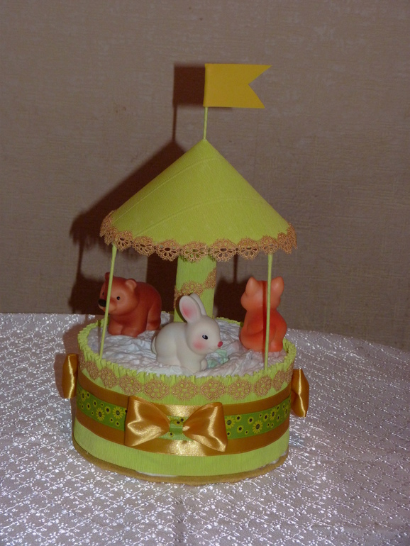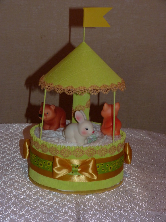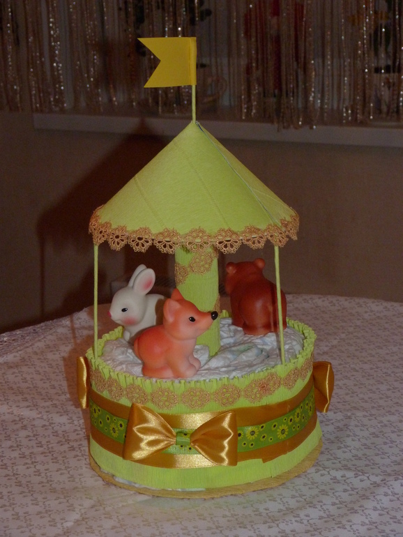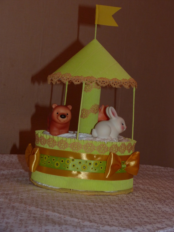 Не созрела я ещё для мастер-класса, могу только "на пальцах " объяснить, а зверики - это игрушки для ванной, у них снизу дырочка имеется, туда вставила шпажку - другой конец между подгузниками...