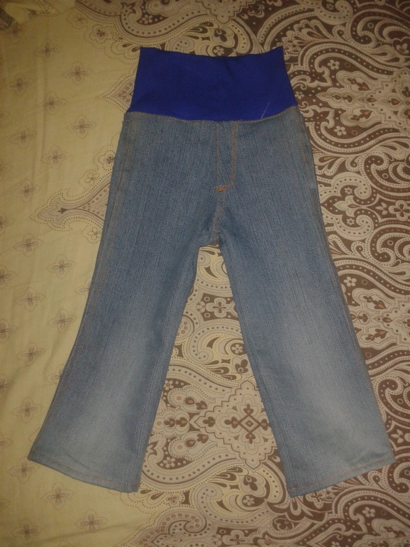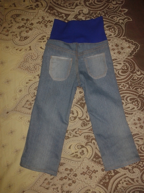 нк а это доделала сегодня, для доченьки, сшила из своих старых джинс, выкройку нашла в интернете, большую, поэтому шиоа без прибавок на швы. молнию пока вставлятт для меня сложновато, поэтому сделали, с трикотажным пояском. сделала побольше, что бы спинка была закрыта, стали напоминать джинсы для бнременяшек))))