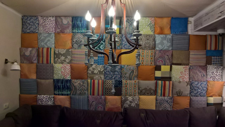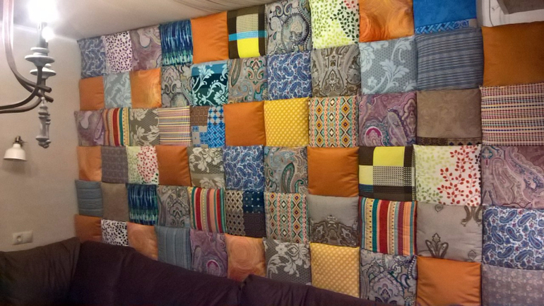 Такие подушки не шьют, это берется фанера, и степлером крепится ткань, под нее кладется синтепон (синтепух), и потом такая "плитка" крепится на стену