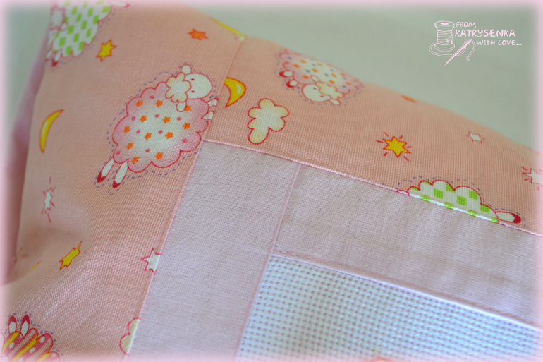 Итак, для наволочки использовала плотный хлопок Оксфорд с овечками и тоненький розовенький хлопок нашего украинского производства (влюбилась в его качество - купила ещё - буду использовать), для того, чтобы уровнять плотности, уплотнила тканевым дублерином. Центральное место на наволочке занимает вышивка - тоже продублировала тканевым дублерином.