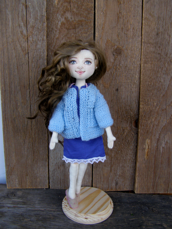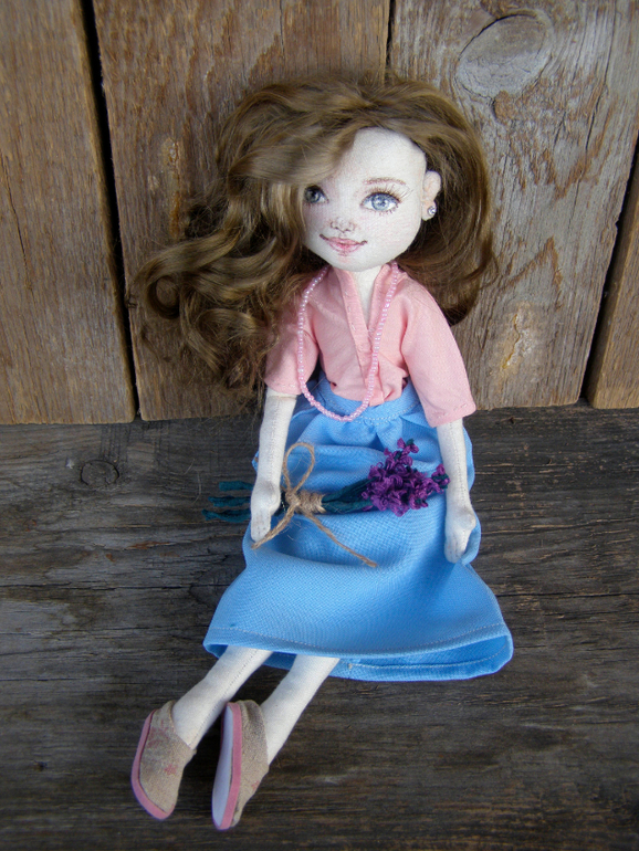 Кукольный мир - человекоподобные куклыВ этот раз куколка по фото...прекрасная девушка . Сшита из небеленого хлопка. Стоит с подставкой. Сидит красиво). На ножках обувка ручной работы. Волосы проклеены и прошиты, можно причесывать и делать прически. Три комплекта нарядов. Вся одежка съемная. Реснички приклеены, личико расписано акрилом и маслом.У малышки подвижные ручки и ножки. Из аксессуаров букетик лаванды и Евангелия. Жаль что нет фото для сравнения(.