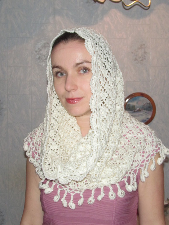 Если хотите пошикарнее, тчтобы и на голову накидывать, то нужно 45 в высоту и 45 в ширину. Но все зависит от роста, у меня рост 165 и объем головы 58 см, если рост 155, то он как шаль уже будет выглядеть