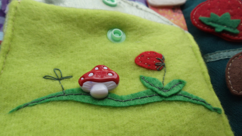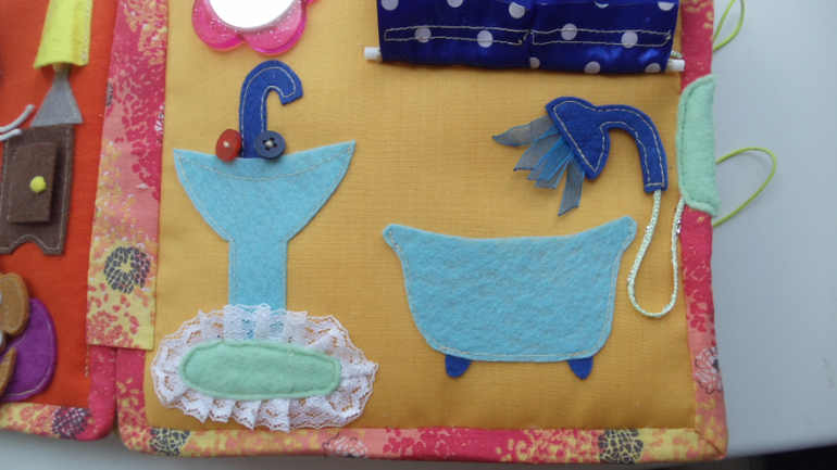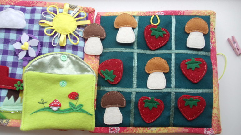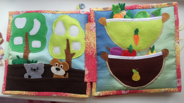 Развивающие игрушкиДошила еще одну книжечку. Очень мне нравится. Кроме развивающих моментов много и игровых. Как всегда застежки, липучки, кнопочки, пуговки, звоночки, счет и многое другое)))