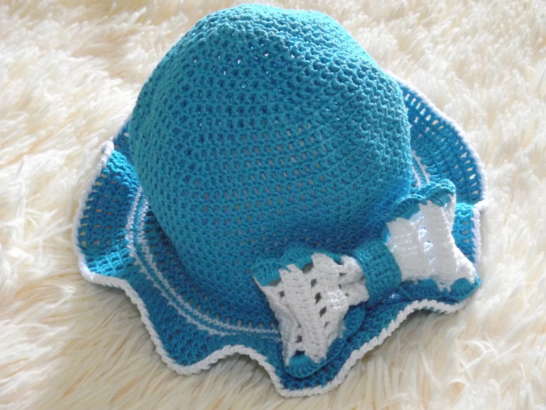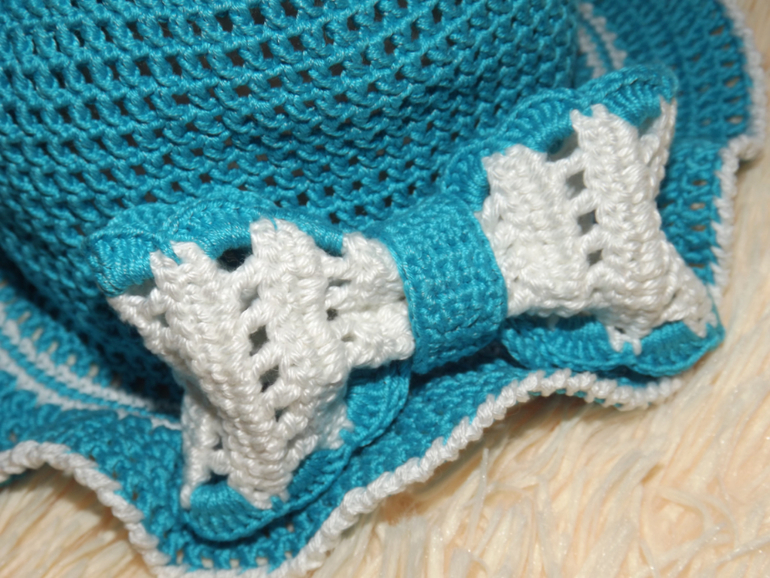 Бирюзовые ниточки - это пехорка "Летняя", 100% хлопок, 100г. 330м., белые ниточки - "Камтекс", 100% хлопок, 50г. 200м., вязала крючком №2.