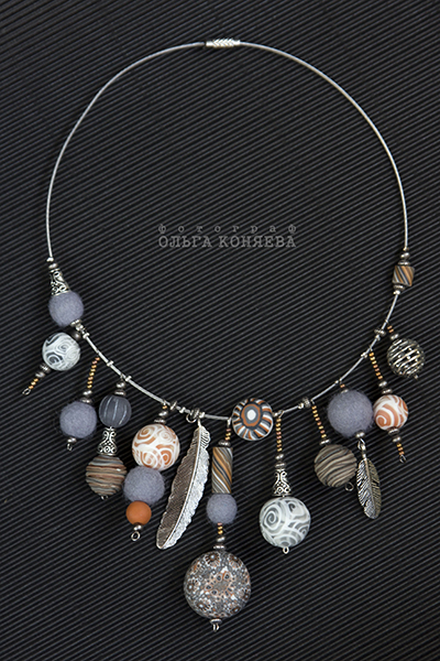 Полимерная глина, войлок, все бусины (кроме металла) вручную сделаны мной. Дизайн конечно же тоже мой.