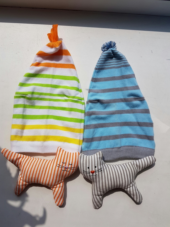Размер любой. Длина стопы - это высота зауженного колпачка ( засуживаем сами). Но лучше брать носки большие, чтобы хватило ширины голени - это объем шапки. Также значение имеет высота голени - это высота шапки. Разрез делаем по середине стопы - носки лежат как на фото. Пятку вырезаем - отметила коричневой лентой- и полученное отверстие стачиваем. ) Потом два разрезанных носка соединяем между собой - два шва в итоге. Если остались вопросы - спрашивайте!