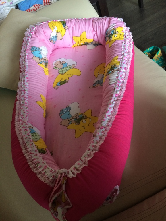 Очень удачная первая работа!) Кокон - очень удобная вещь! Дочь почти до 2 месяцев в переноске от коляски спала, кокон был бы очень кстати тогда)