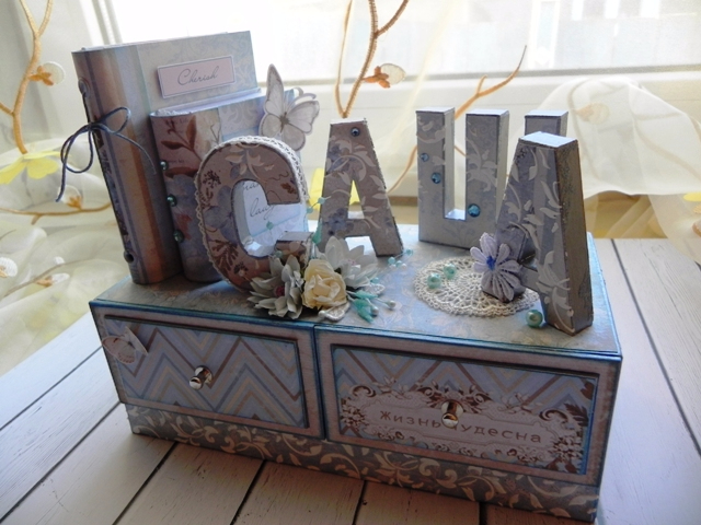 просто не смогла пройти мимо подобного комодика. К моему счастью Светлана согласилась со мной поменяться. Получила я его давно, но т.к. комод был выполнен для подарка моей племяшке, то показать его сразу я не могла. Не хотелось рассекречиваться