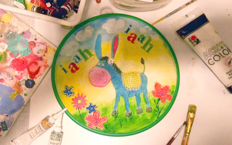 На самом деле если бы следовали инструкции фуфло бы получилось. Предлагали белый фон покрыть целиком желтым цветом. Зачем, что бы поблек осел? И вообще что за странная идея наносить акриловые краски на толстый лен? Сильно впитываются и образовываются пятна. Я то свои краски достала... В общем, творчество не может быть в наборе. Творчество может быть только в голове !