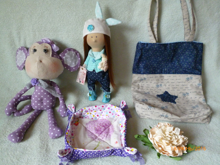 Это Юлечкины суперские рукоделочки. Моя мечта сбылась- теперь у меня дома поселилась куколка-большеножка! Как же она мне нравится, восхитительная девочка, фото не передаёт всей красоты!!! Хотя Юля прислала её для моей старшей дочки- но я куколку "прихватизировала" себе))) С обезьянкой младшая дочка спит и теперь у нас это любимая игрушка)) Конфетница тоже уже служит по назначению на моей кухне, брошь-пион шикарная, а сумочка теперь всегда со мной и на прогулке и в магазине, очень здоровская, вместительная, аккуратная!