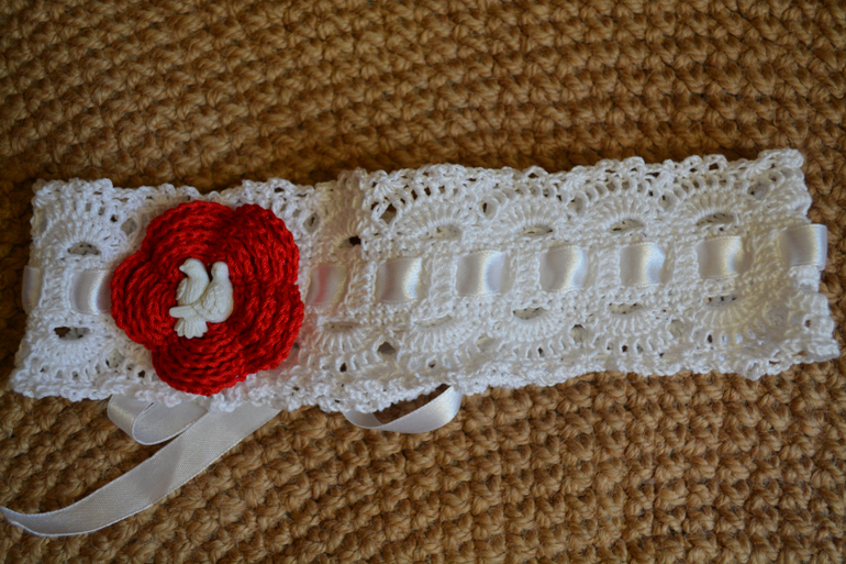 Вязание крючком (РАБОТЫ И СХЕМЫ)Повязочка застегивается на липучку сзади и завязывается на ленточку. Выглядит довольно мило.