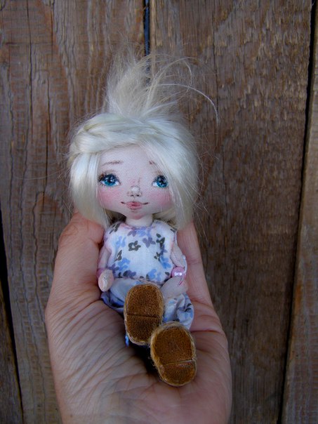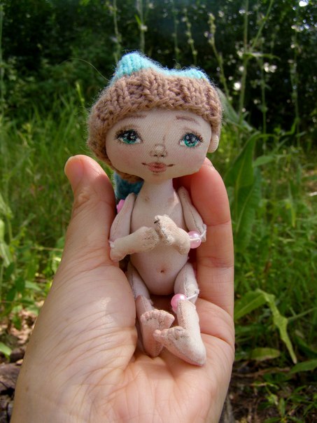 Кукольный мир - человекоподобные куклыМалышка...шарнирная ... Крошечная девочка с большим и добрым сердечком. Одета в платьице из хлопка, кружевные трусишки ,вязанную шапочку и обувку ручной работы. Вся одежка и ботики снимаются. Волосы натуральные локоны козочки, проклеены и прошиты...можно расчесывать и делать прически. Личико расписано акрилом и маслом. Куколка подвижная, крепление пуговичное. Стоять не умеет, сидит красиво)). Солнечная...и ласковая!!!!! Ростик 13см