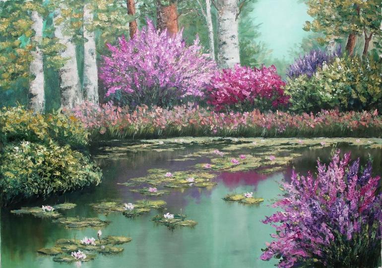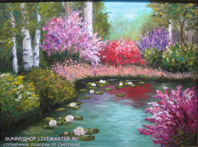 Меня попросили сделать наиболее точный повтор моей картины, которую я писала в самом начале занятий живописью.. может даже она есть в моем альбоме))) пруд сделала в силе накопленного опыта интереснее, а вот дальнюю линию пруда я бы теперь сделала по-другому..